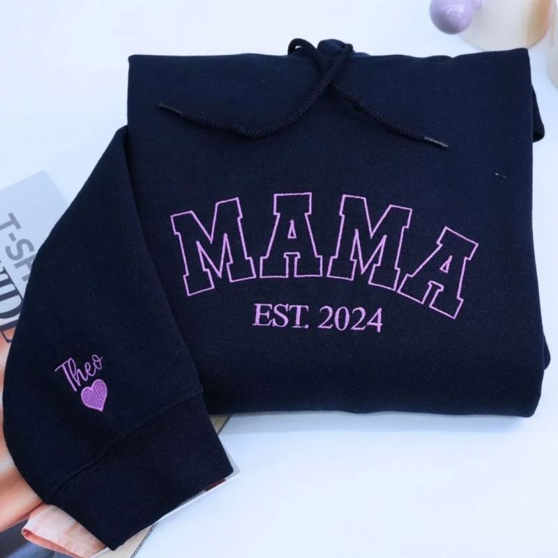 Custom Embroidered Mama Varsity Sweatshirt with EST year and Kids Names on Sleeve, Mother's Day Gift for Mom