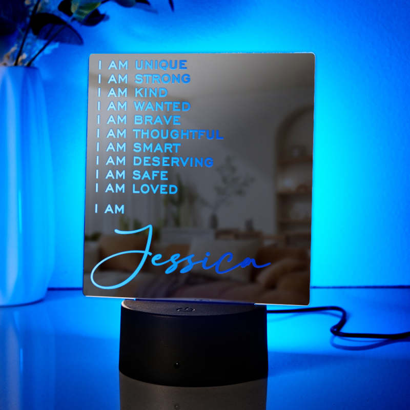 - This super stylish personalised name mirror with LED lighting is a perfect and unique edition to any youngsters bedroom, they will love lighting up the personalised mirror and seeing their own name in lights.This eye-catching personalised name mirror makes the perfect gift for 2024 and it will be cherished and loved for many years to come by the recipient.Includes remote control for LED lighting and chrome wall mounting stand offs.