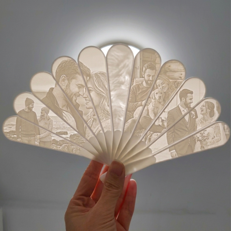 Transform your favorite memories into a stunning piece of art. Our Custom 3D Printed Lithophane Photo Fan is more than just a decoration; it’s a magical way to relive your most cherished moments. Using advanced 3D printing technology, we turn your photos into a textured surface that reveals a high-definition, warm image when backlit.
