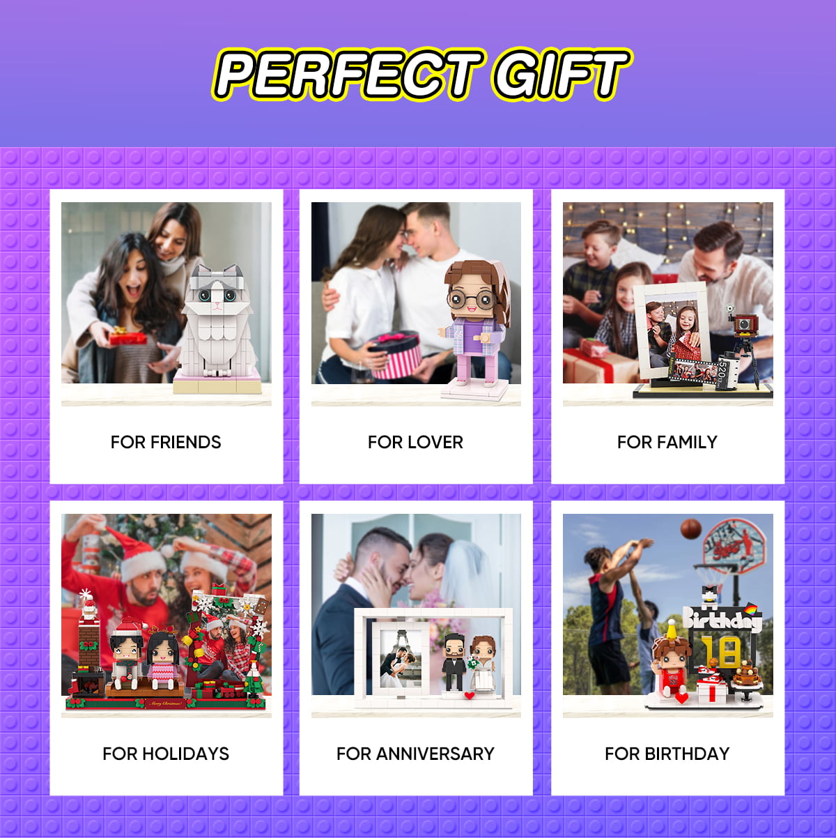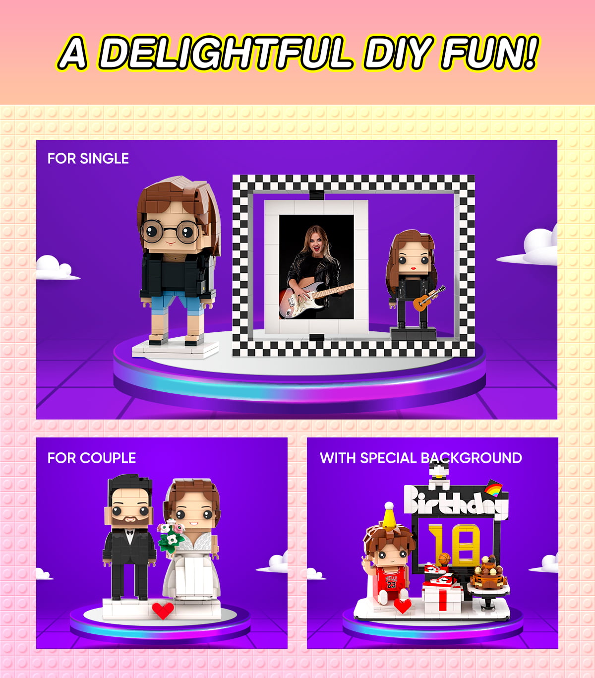 The scope of customization includes the character's hairstyle, expression, clothing, conventional accessories, simple actions and so on. For complex accessories, hand-held items, gestures, etc., may not be well restored, we will try to restore within the structure of the building blocks for you.The production scope doesn't include the big decorations of the image, such as tables, chairs, musical instruments, or animals, etc