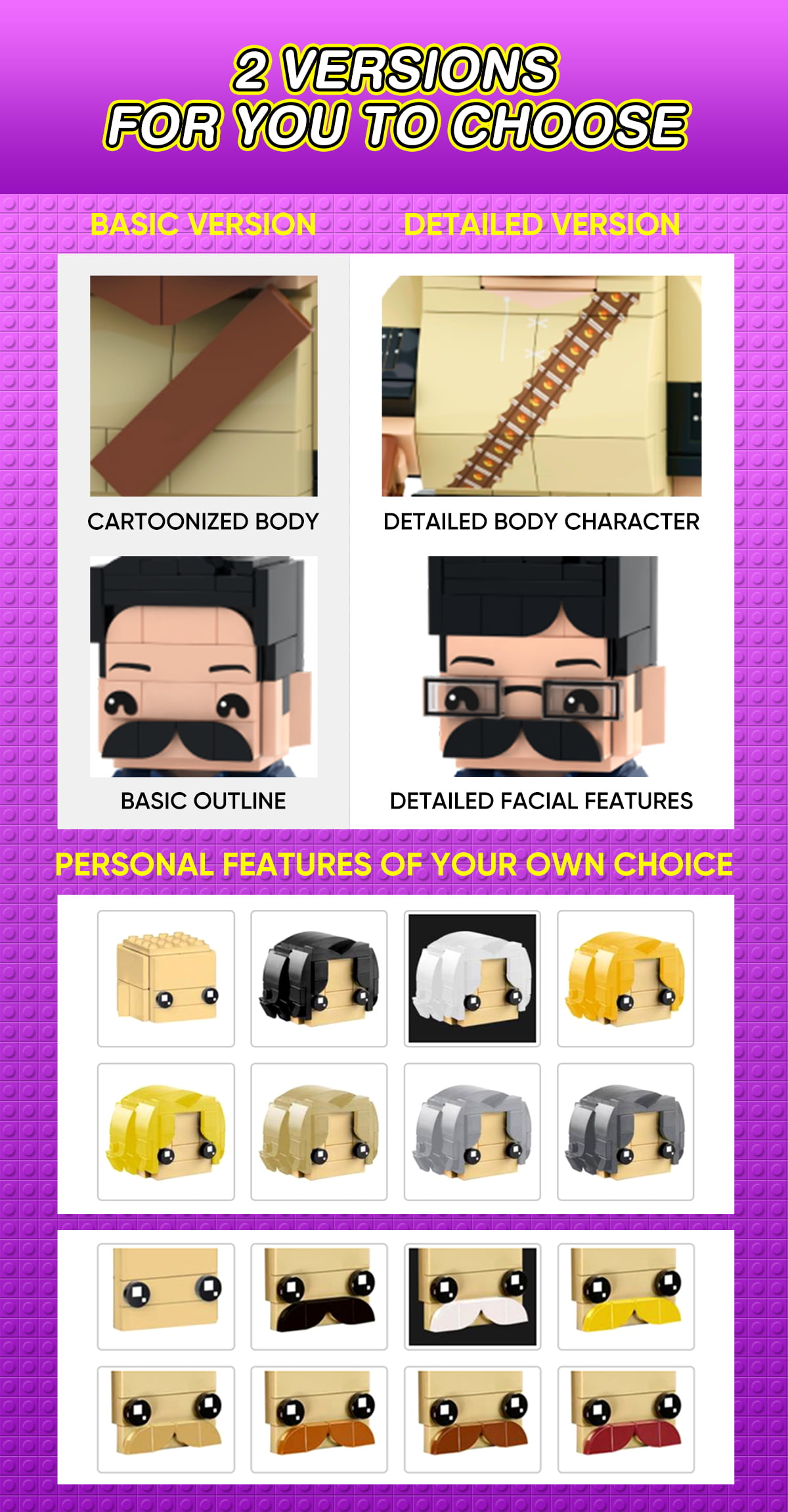 The selection of photos is the beginning of the design of the Block Heads, upload the front, full body, clear, no cover, wearing bright colors, patterned figure photos will be a better choice.