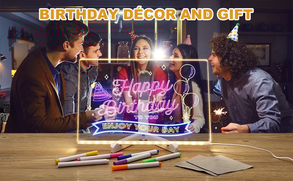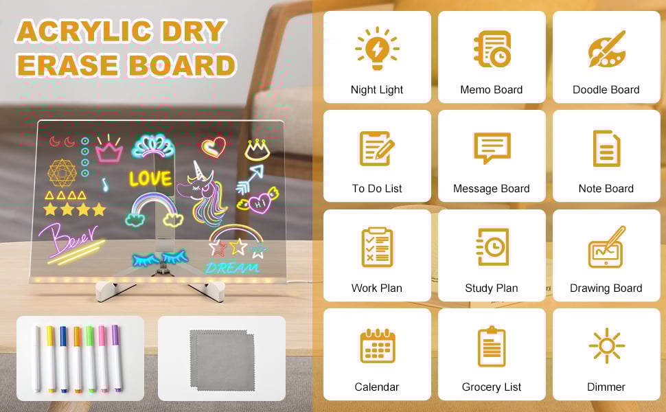 Acrylic lighted note board with colorful LEDs. Great for kids' art, home notes, store displays. Easy - clean and reusable!