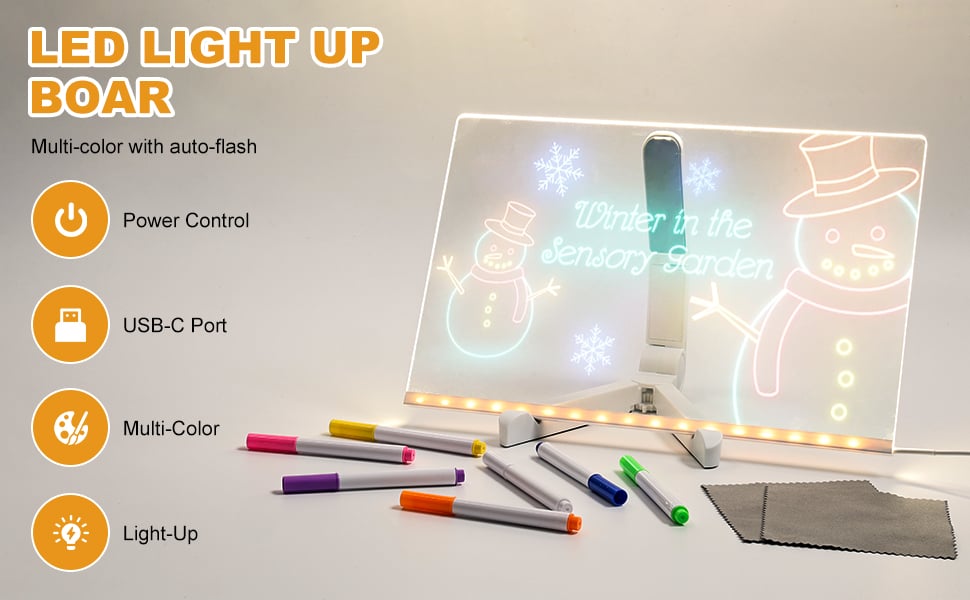 - Package Contents: 1 Lighted Note Board, 1 Stand, 7 Colored Pens, 2 Cleaning Cloths, 1 Instruction Manual